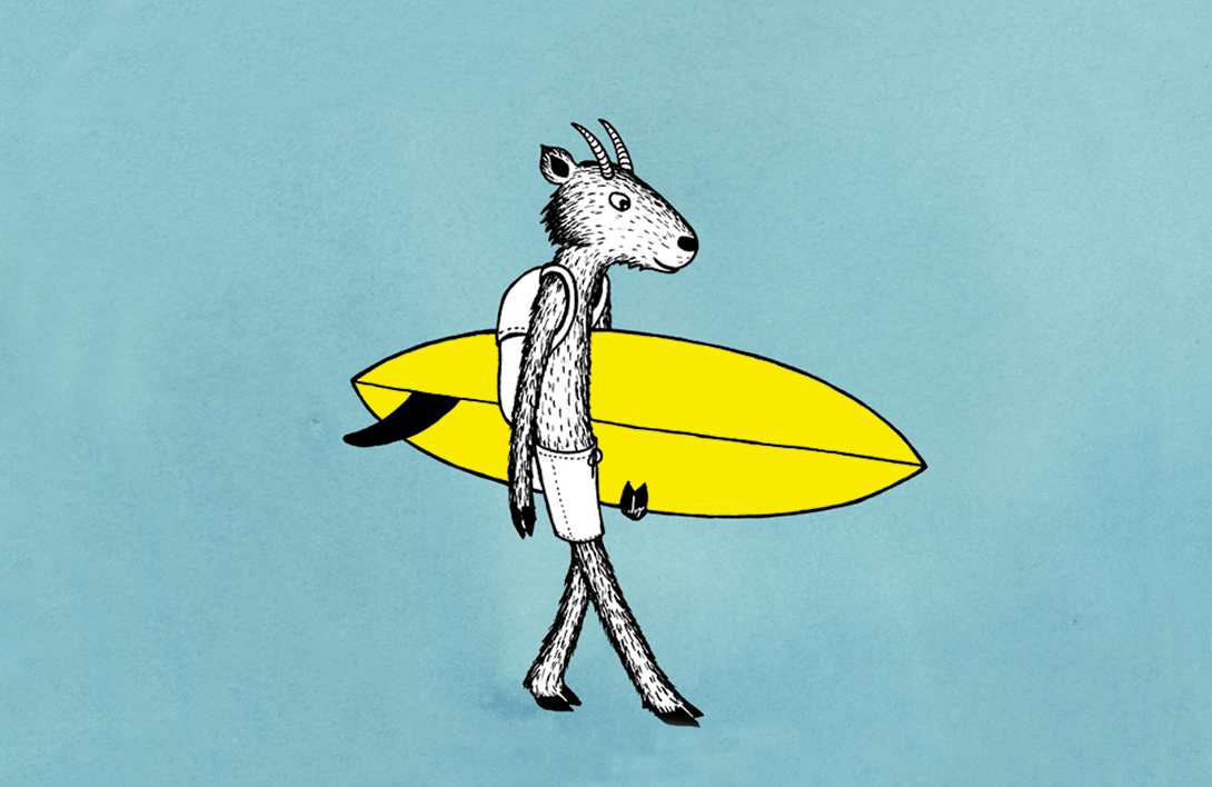 「サーフタウン日向」のイメージキャラクター「ヒュー君」とその仲間たちのイラストがデザインされた名刺です。